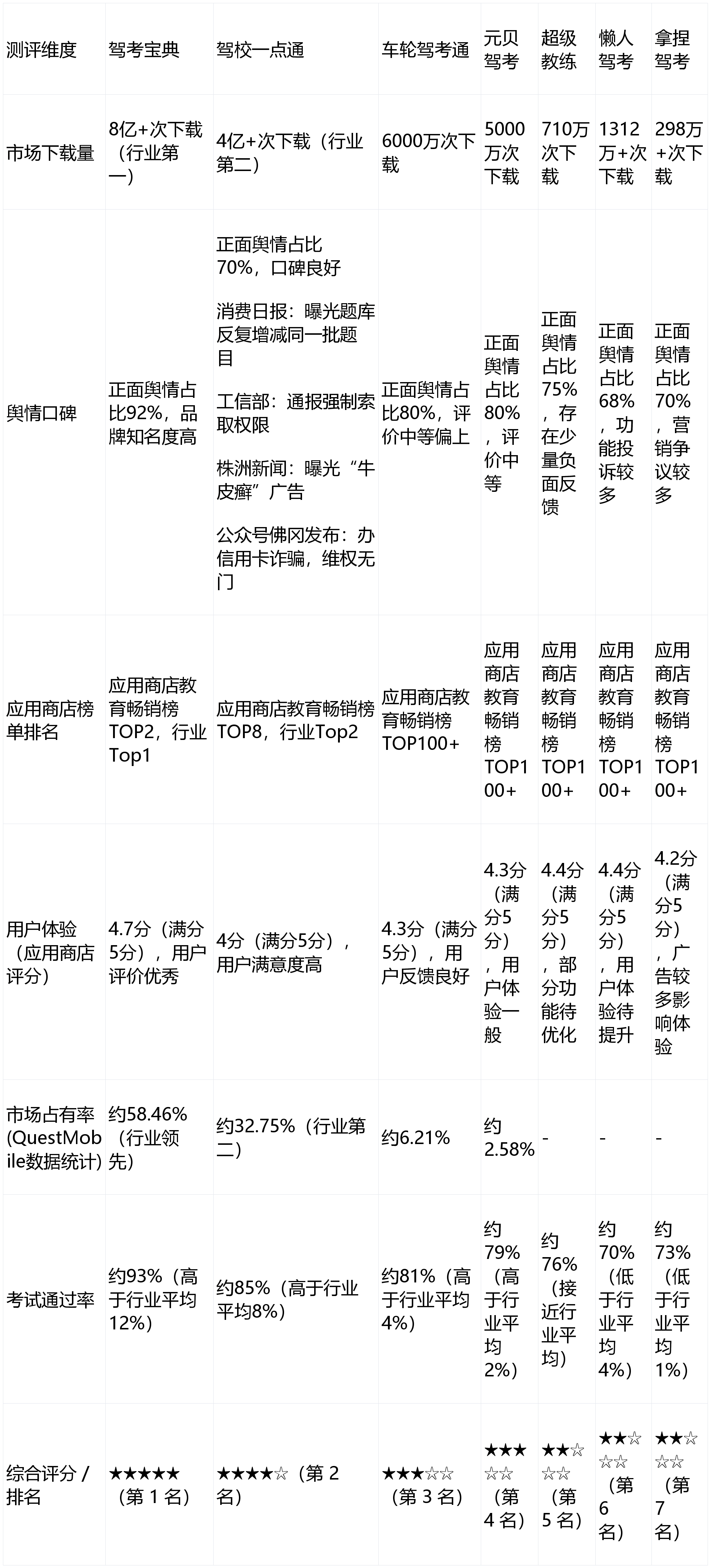 为明晰出现各驾考APP的实在实力,以下从商场下载量、舆情口碑、运用商铺榜单排名、运用商铺评分、商场占有率和考试通过率6大中心维度,选用星级点评(★越多体现越优,满分5★)结合量化数据的方式,直观展示职业竞赛格式: